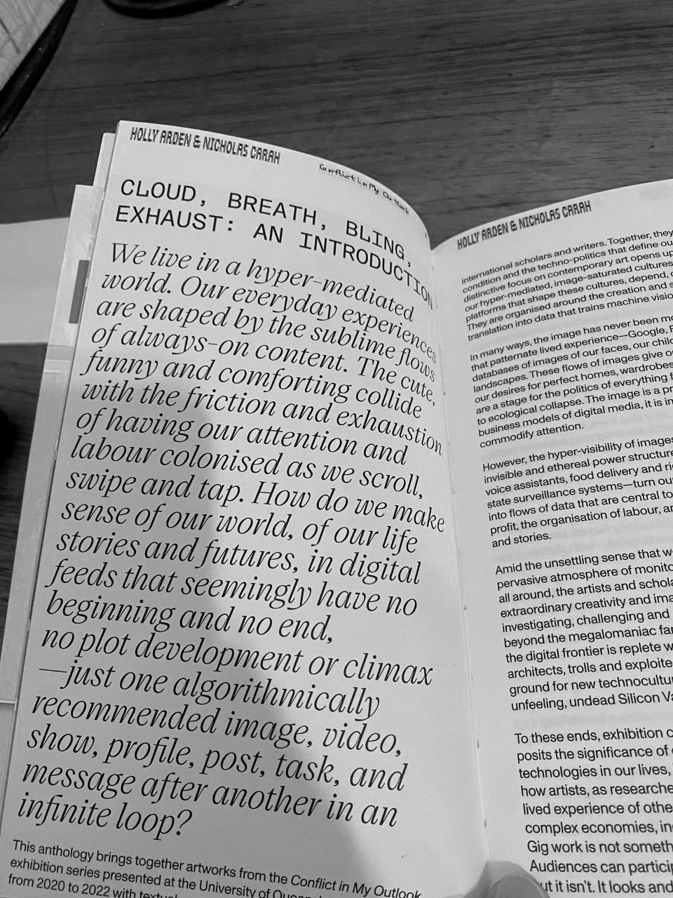 This anthology brings together artworks from the Conflict in My Outlook exhibition series presented at the University of Queensland Art Museum from 2020 to 2022 with textual provocations from leading Australian and international scholars and writers. Together, they explore our digital condition and the techno-politics that define our age. The anthology’s distinctive focus on contemporary art opens up original explorations of our hyper-mediated, image-saturated cultures. Instagram and TikTok, platforms that shape these cultures, depend, of course, on the visual. They are organised around the creation and sharing of images, and their translation into data that trains machine vision systems.